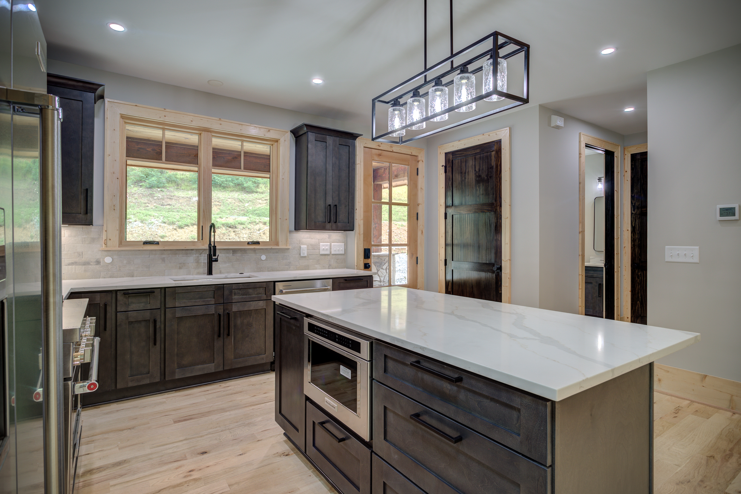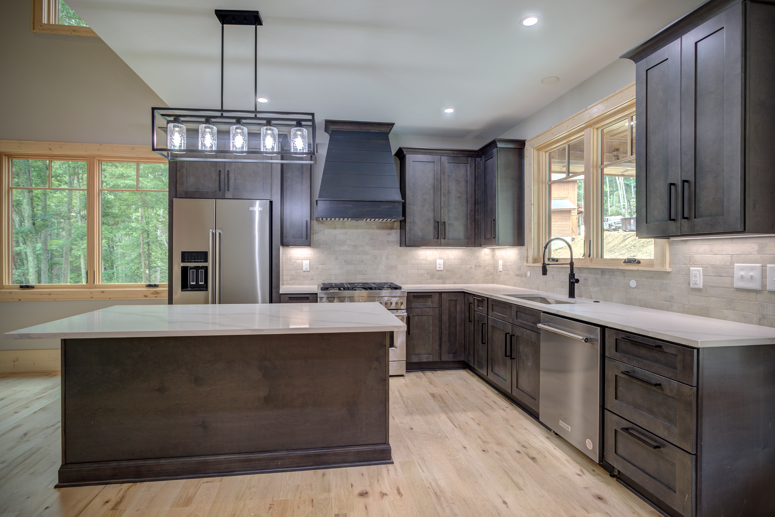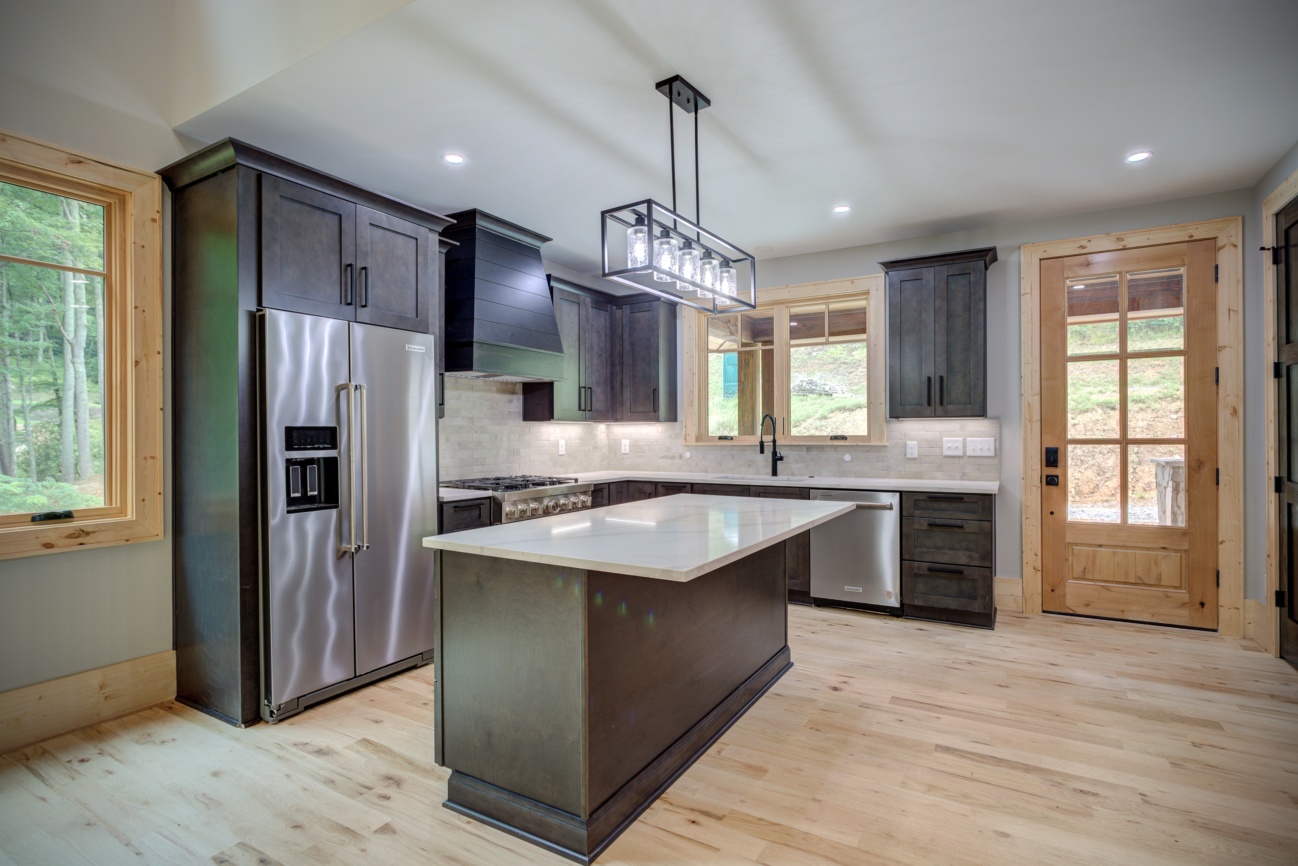 Carolina. Greystone Shaker cabinets with Calacatta Quartz Countertops throughout, bleached red oak floors,