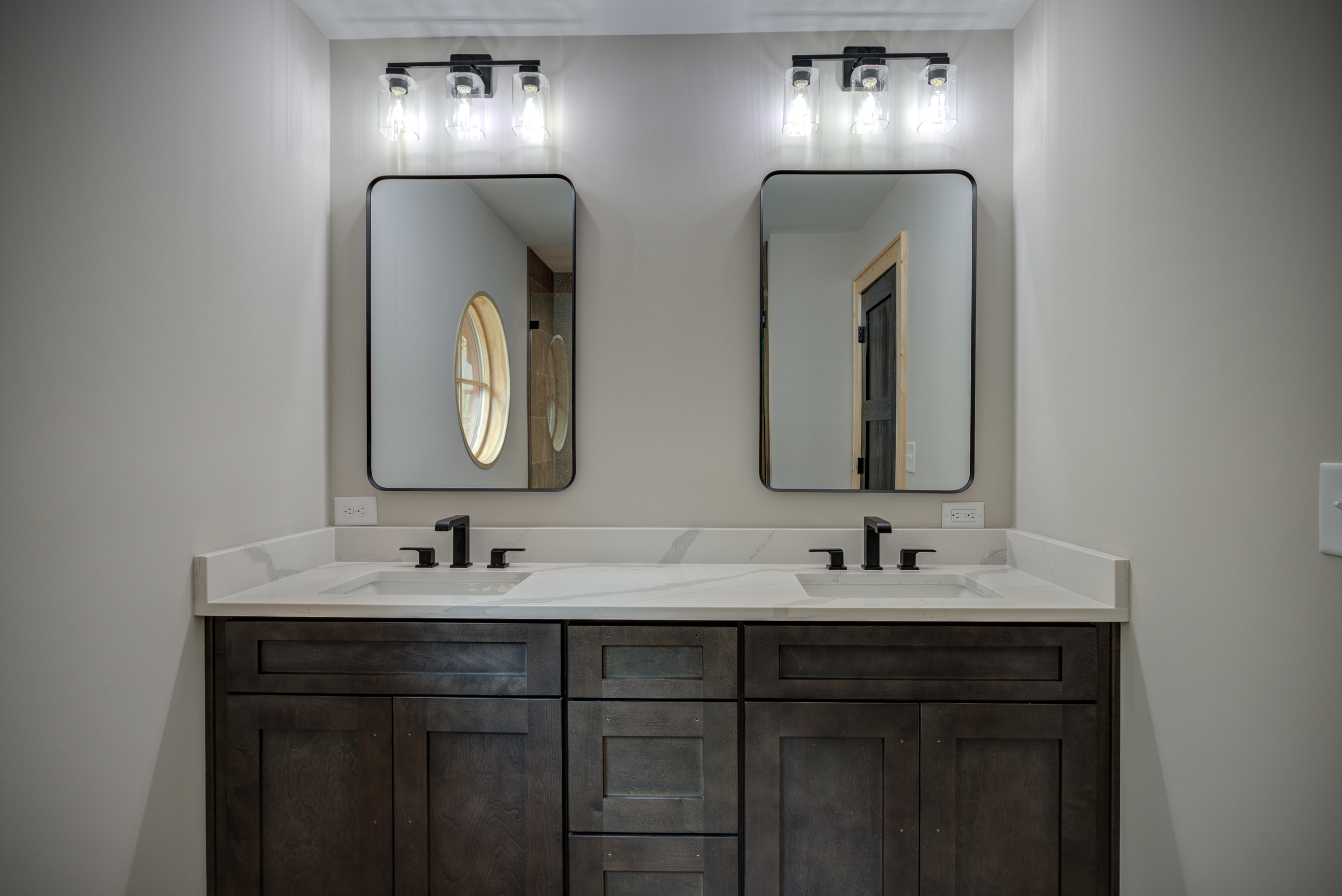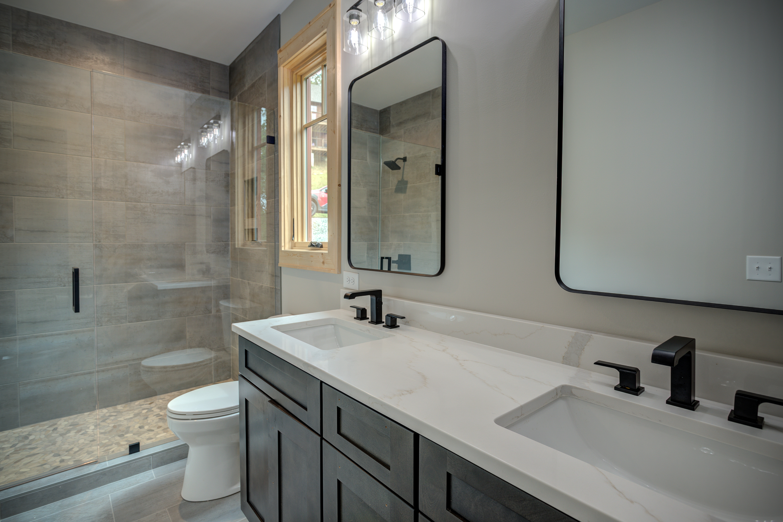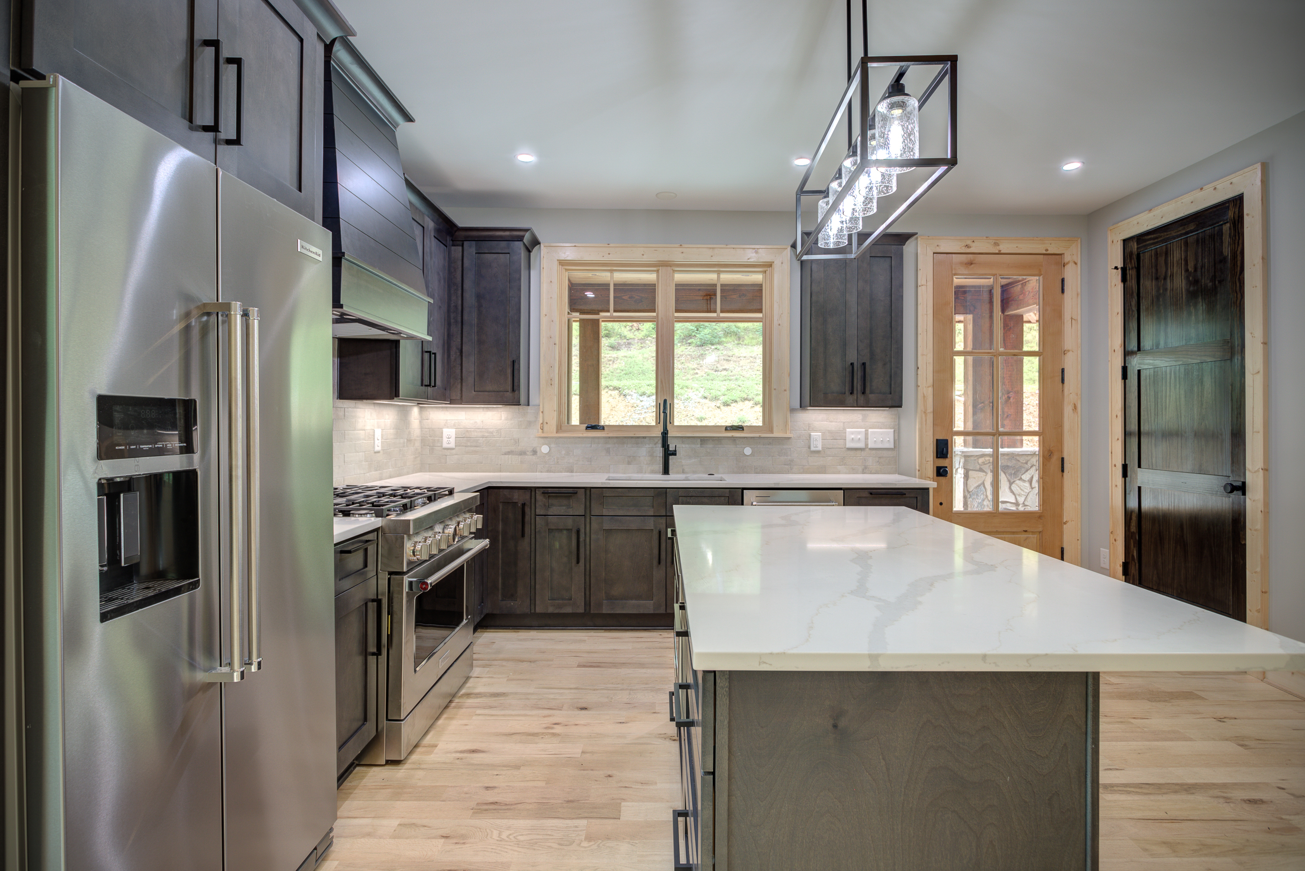 Carolina. Greystone Shaker cabinets with Calacatta Quartz Countertops throughout, bleached red oak floors,
